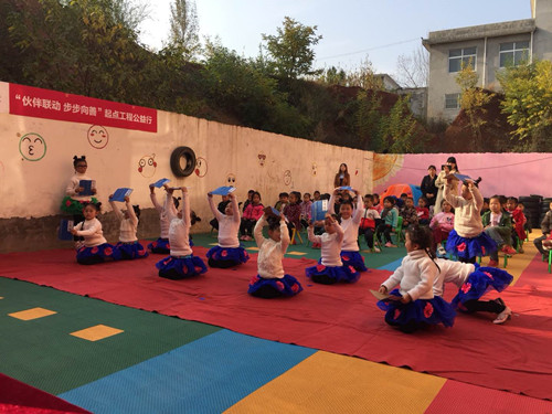 汝阳县上店镇下店村行知幼儿园的老师与小朋友们和远道而来的大朋友们互动游戏,用有趣的节目和小游戏表达自己愉悦的心情和感激之情。