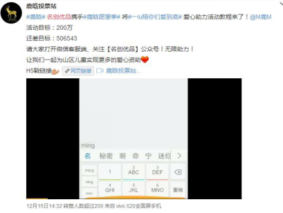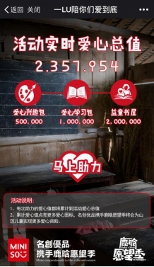 “感恩奉献,回馈社会,以公益慈善为己任”一直以来都是名创优品的品牌理念。这与鹿晗愿望季的内涵不谋而合。于是今年12月,名创优品携手鹿晗愿望季,发起“一LU陪你们,爱到底之爱心助力”活动,呼吁鹿饭们关注山区儿童的愿望,为他们捐赠课外读物和学习用品。与他们的偶像一样,鹿饭们为公益不遗余力,短短几天便达成了贡献200万爱心值的目标。