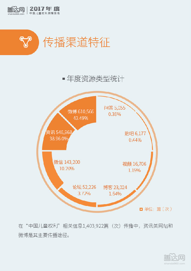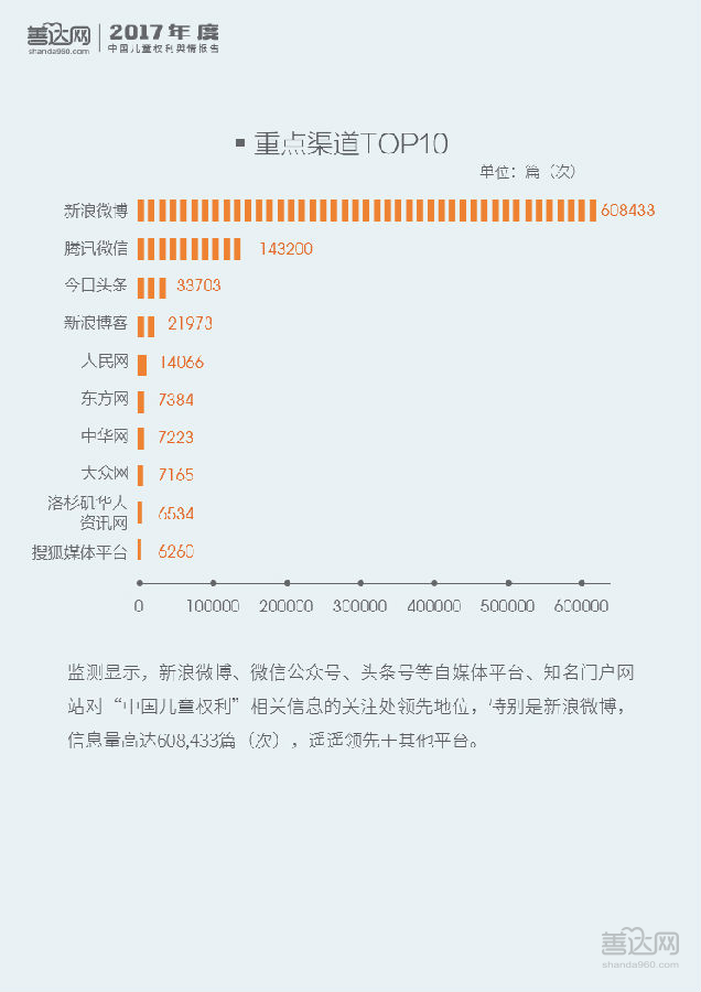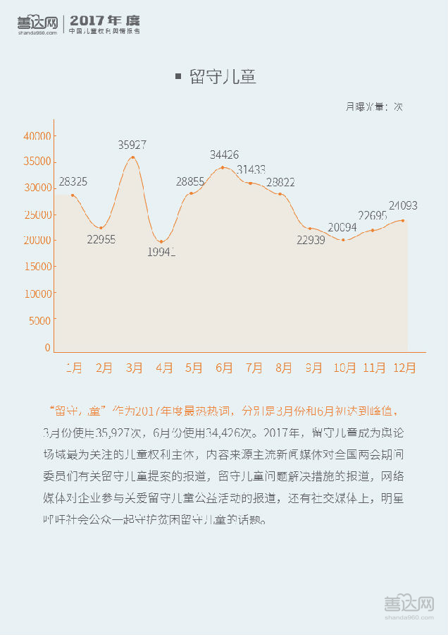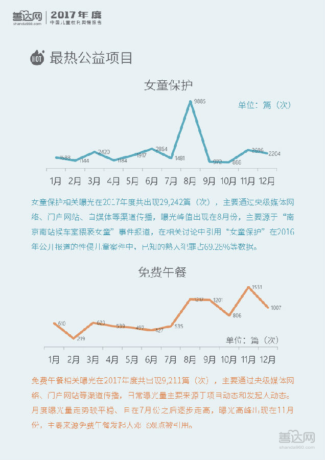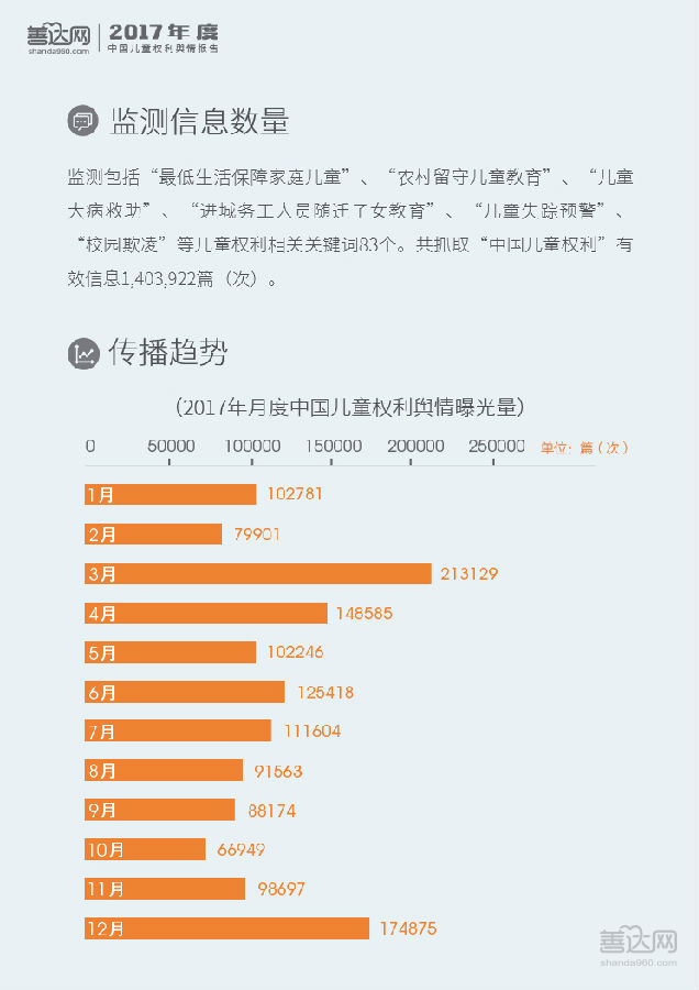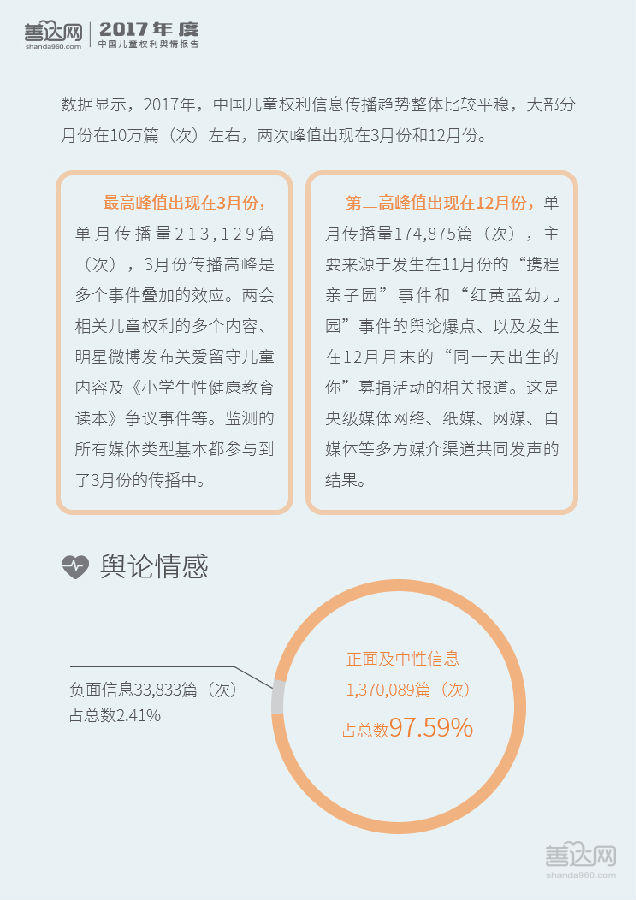 2017年全年,儿童权利信息曝光量为1,403,922篇(次),其中97.59%为正面和中性信息。全国两会层面对“未成年人保护法”、“留守儿童”、“儿童防性侵”等开展讨论促成了3月的舆情峰值,表明儿童权利议题已成主流议题。