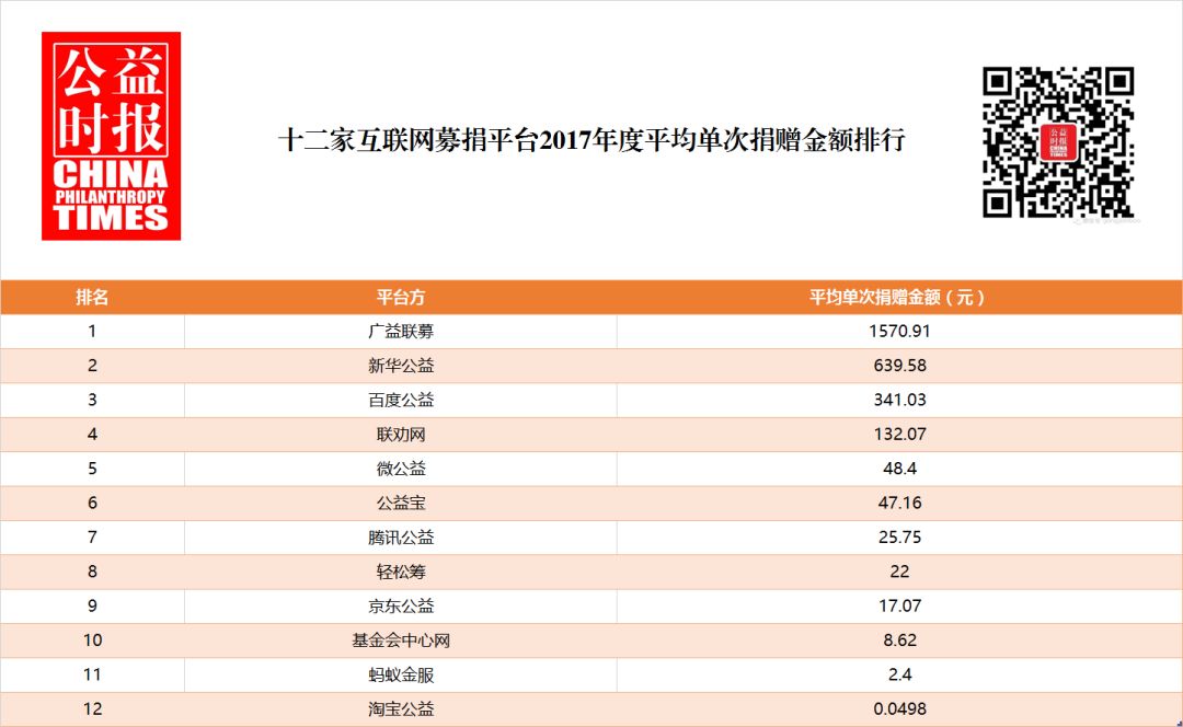 通过各平台2017年度筹款总额与全年累计捐赠人次,我们对各平台单次捐赠的平均金额进行排名,广益联募平台2017年度募款总额6912万,全年累计捐赠人次4.4万次,平均单次捐赠金额高达1570.91元;新华公益平台和百度公益平台平均单次捐赠金额也达到63.647元和341.03元,分列二四位。腾讯公益平台全年累计募款16.25亿,累计捐赠人次6310万次,平均单次捐赠金额为25.75元,位列第7,淘宝公益平台因捐赠人次高达59.8亿次,其平均单次捐赠金额为0.0498元。