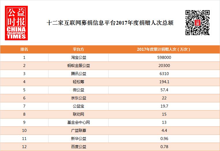 2017年全年,通过12家互联网募捐平台完成的捐赠次数超过62亿次(62.493734亿),相当于全民全年人均完成4.5次捐赠(国家统计局2016年人口普查,中国总人口13.83亿)。其中,淘宝公益平台捐赠人次达59.8亿次,为12家互联网募捐平台全年累计捐赠人次榜第一,且相当于其余11家平台全年捐赠人次的203倍,其超高捐赠人次得益于淘宝公益平台推出的“公益宝贝”计划,淘宝卖家加入该计划后,每完成一笔交易即意味着完成一次小额公益捐赠,而根据淘宝公益平台年度运营报告显示,平台2017年度2.98亿的筹款总额中,83%来自于公益宝贝捐赠。此外,蚂蚁金服公益平台和腾讯公益平台全年捐赠人次达2.03亿次和6310万次,分列二三位。而位居第四、五位的轻松筹、微公益平台,全年捐赠人次为194.1万次和57.4万次;京东公益平台包括物资捐赠人次和现金捐赠人次,总数近22万次。新华公益平台2017年度累计捐赠人次为9657次。百度公益平台全年累计捐赠人次为7821次,其中“壹基金海洋天堂计划”一个项目的捐赠人次即为5471次。