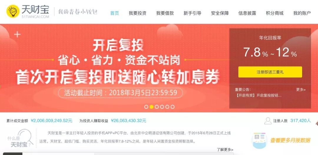天财宝运营主体为北京中企明道征信有限公司,公司成立于2015年7月,注册资金1亿,经营范围包括投资管理、资产管理、经济贸易咨询等。其创建的天财宝平台于2015年6月正式上线,并将自身定位为一家主打年轻人投资的平台。目前平台涉及投资理财、资金借贷两大业务。但平台现今尚未涉及任何公益内容,也未开设专门的公益板块。