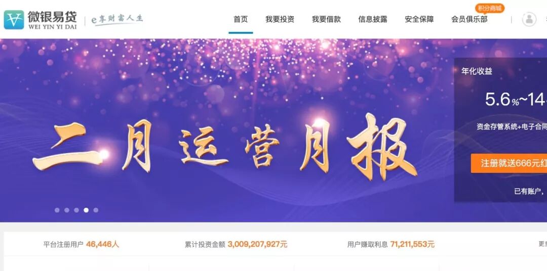 微银易贷运营主体为北京微银时代网络科技有限公司,公司成立于2015年8月,注册资本2000万,经营范围包括技术推广服务、投资管理、企业策划等等。微银易贷是其建设运营的一家定位为快捷、专业、高效的互联网金融信息服务平台,于2016年7月正式上线,目前该平台涉及包括投资理财、资金借贷量大业务,其官网显示平台注册用户46438人,截至目前,该平台尚未开通公益板块。