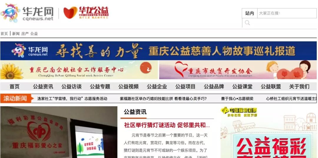 华龙公益网于2017年6月上线。平台整合重庆市民政局、重庆市妇联、团市委、市慈善联合会、等政府职能部门,集合本地公益项目进行展示,形成公益信息交流平台,捐助窗口。