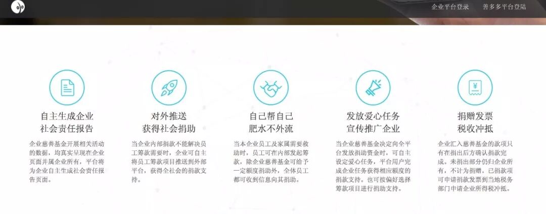 善多多平台介绍中,其定位为帮助企业自主做慈善,企业通过善多多平台自主注册慈善基金账户,并将企业员工、客户、合作伙伴作为受益对象拉入企业的慈善基金社群,一起与企业开展慈善、分享慈善、传播慈善,慈善基金账户由企业自主管理,自己支配。
