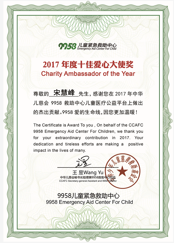 宋主任荣获9958救助中心2017年度十佳爱心大使奖