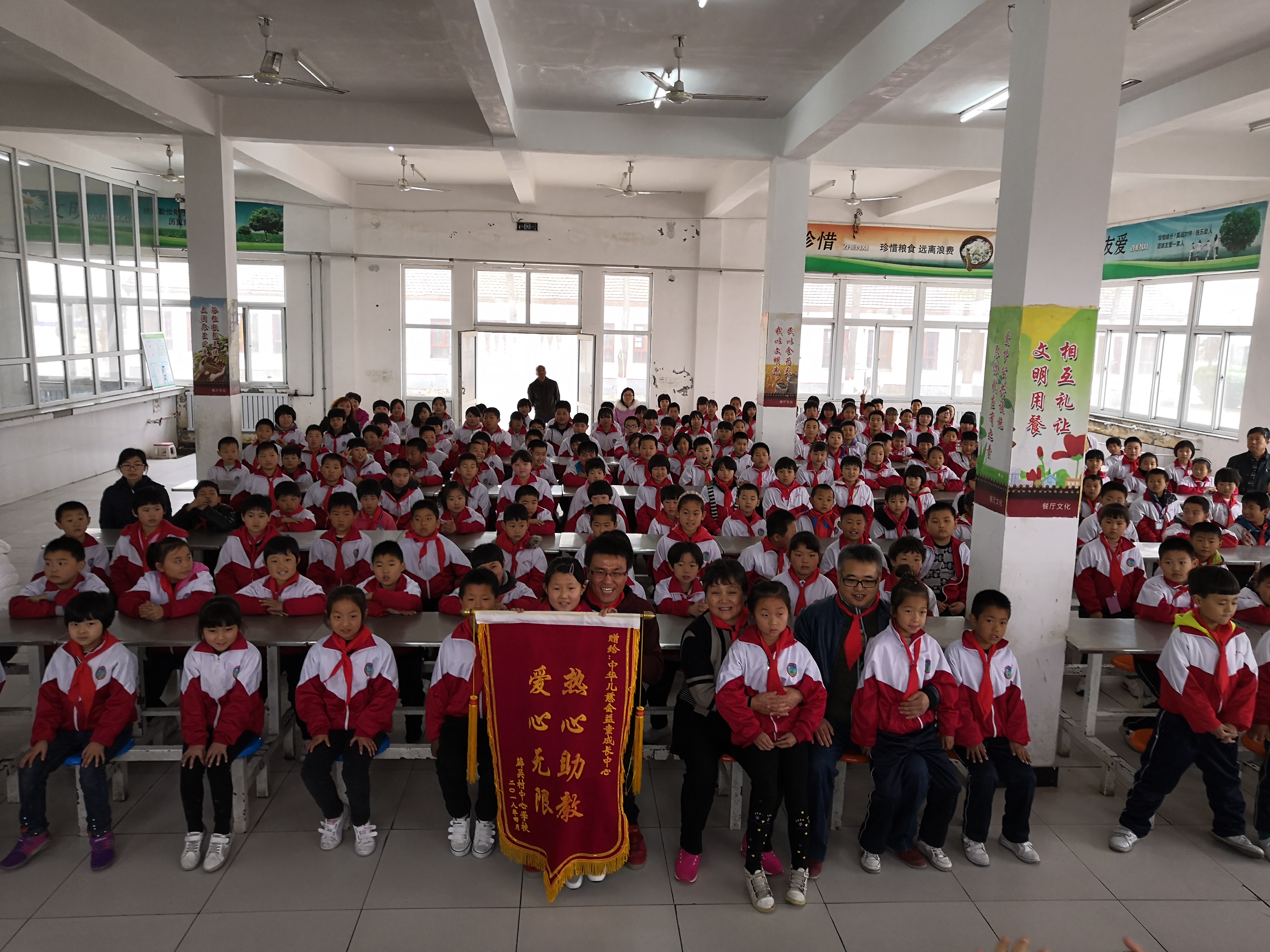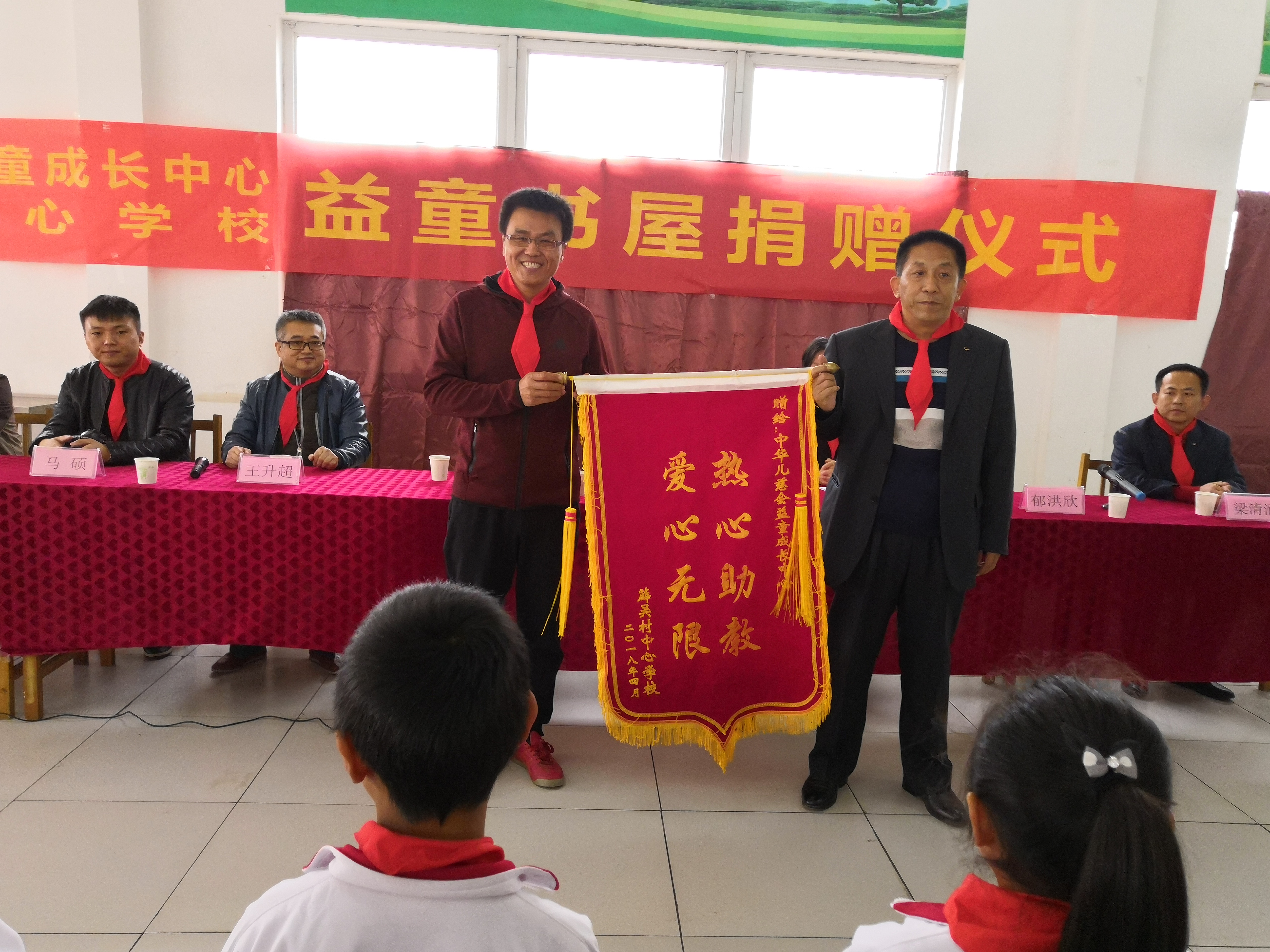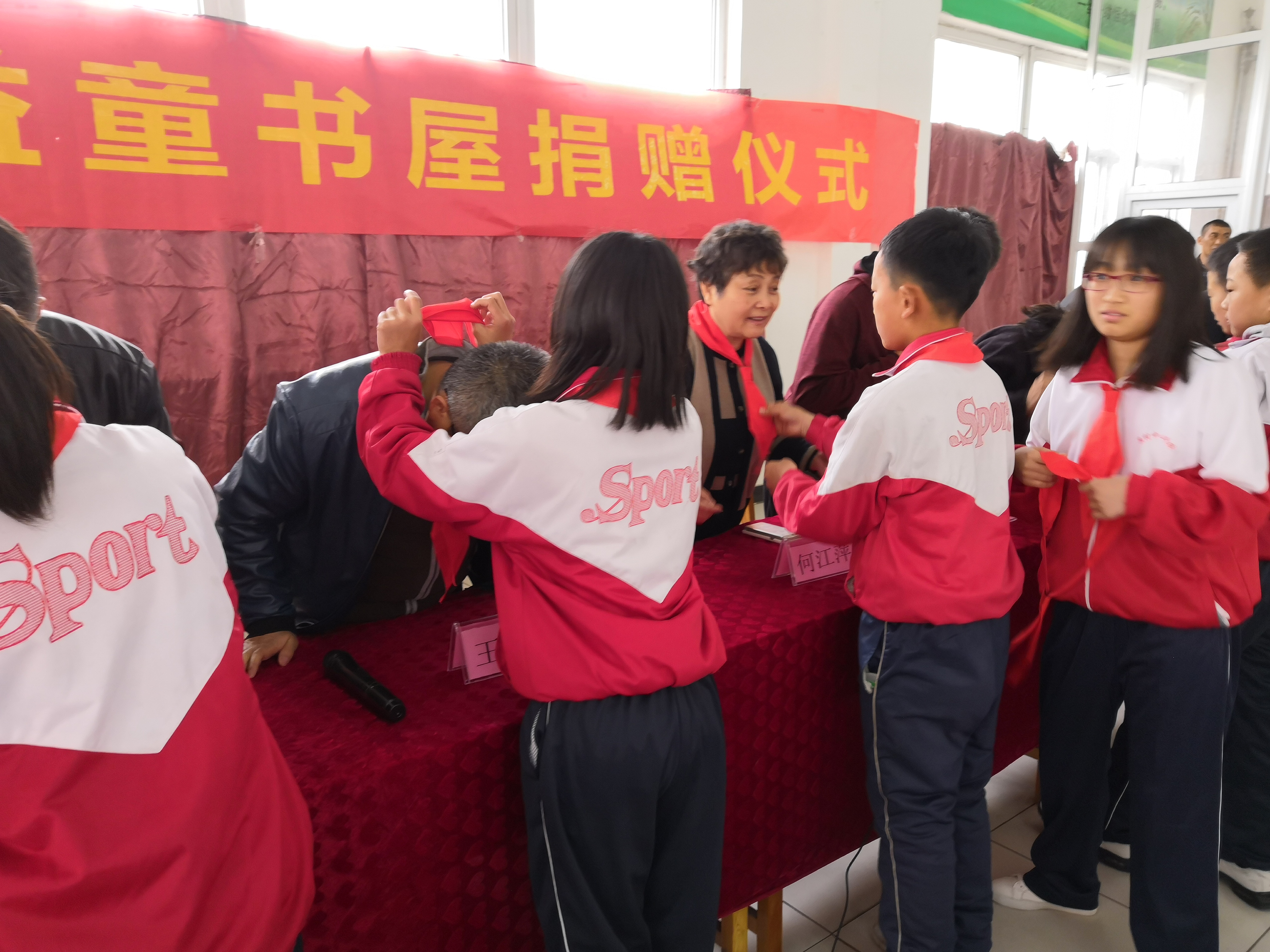 因天气下雨,原定在操场举行的捐赠仪式改在食堂举行。中华儿慈会益童成长中心总监何江萍女士在孩子们为她戴上红领巾时想起自己53年前戴上红领巾时的激动心情,她鼓励孩子们好好利用本次捐赠的两千多册图书,用知识充实自己,让书香在校园飘荡。