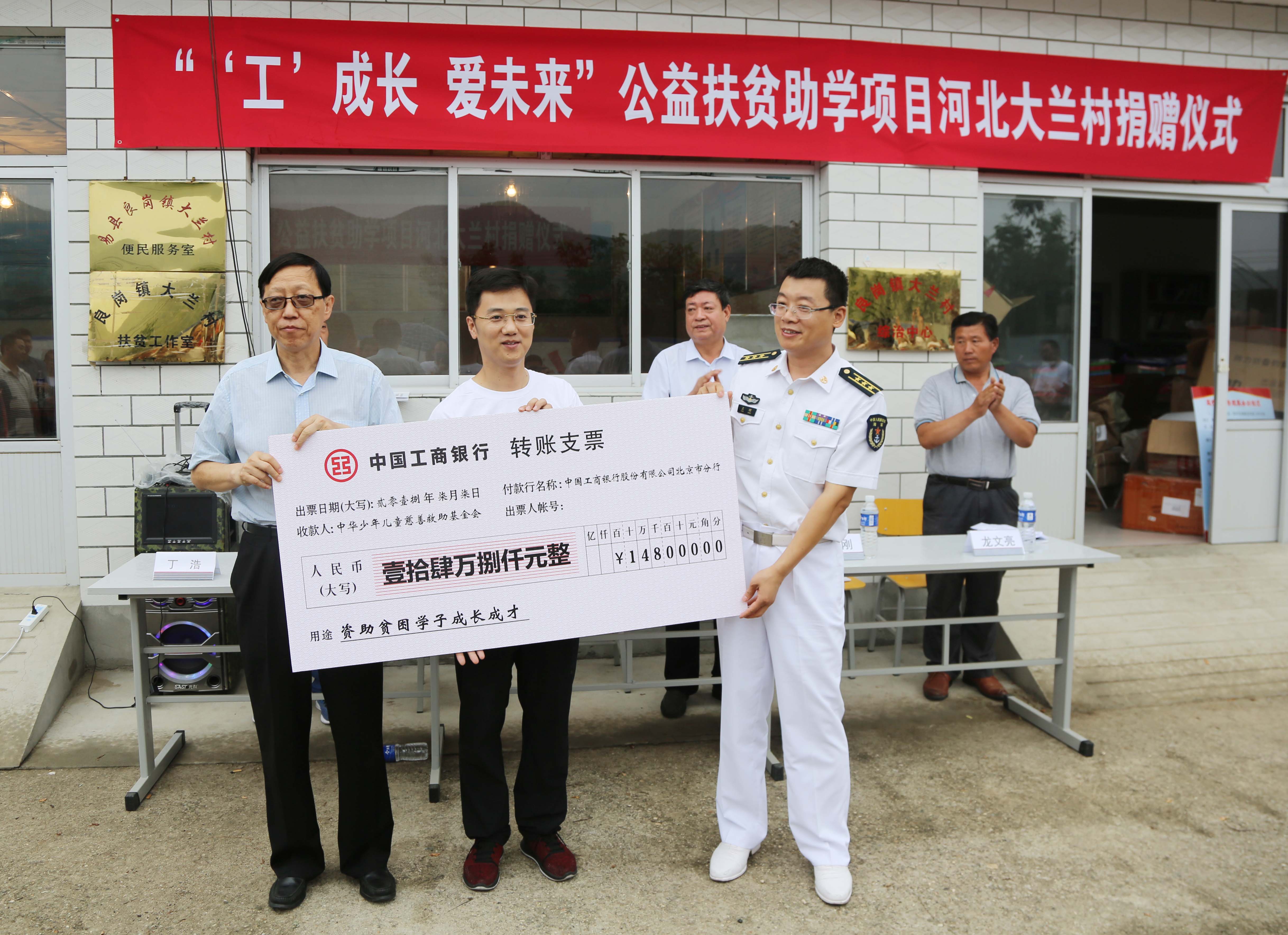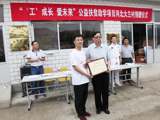 2018年7月7日上午,由中华少年儿童慈善救助基金会(以下简称:中华儿慈会)携手工商银行北京分行与海军政治工作部群工联络局联合主办,河北大兰村村支部承办的“工成长·爱未来”公益扶贫助学项目河北大兰村捐赠仪式在河北大兰村隆重举行。联合多方力量开展本次公益扶贫助学项目,旨在为河北大兰村的困境儿童的成长、教育等方面助力,一同守护他们健康快乐成长。