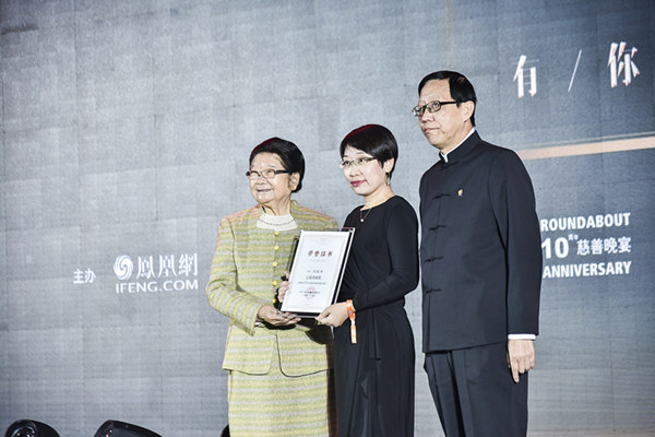 顾秀莲主任为凤凰网颁奖,凤凰网市场与公关部总经理、凤凰网公益专项基金执行主任侯春艳女士代为领奖
