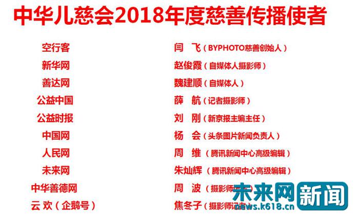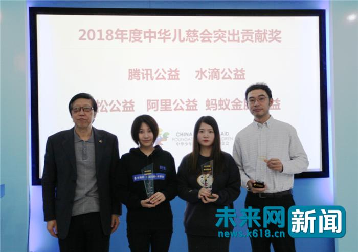 为感谢爱心企业、爱心公益平台、爱心媒体一直以来的支持,中华儿慈会特颁发了“慈善传播使者”奖、“慈善推动力”奖和“突出贡献”奖。未来网与新华网、人民网、公益时报等多家媒体荣获2018年度“慈善传播使者”奖。腾讯公益、水滴公益、轻松公益、阿里公益、蚂蚁金服公益荣获2018“会突出贡献”奖。