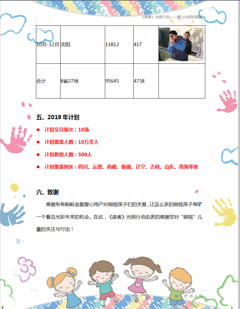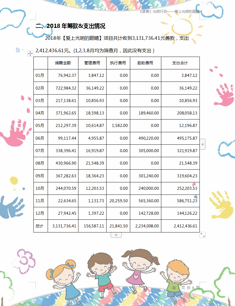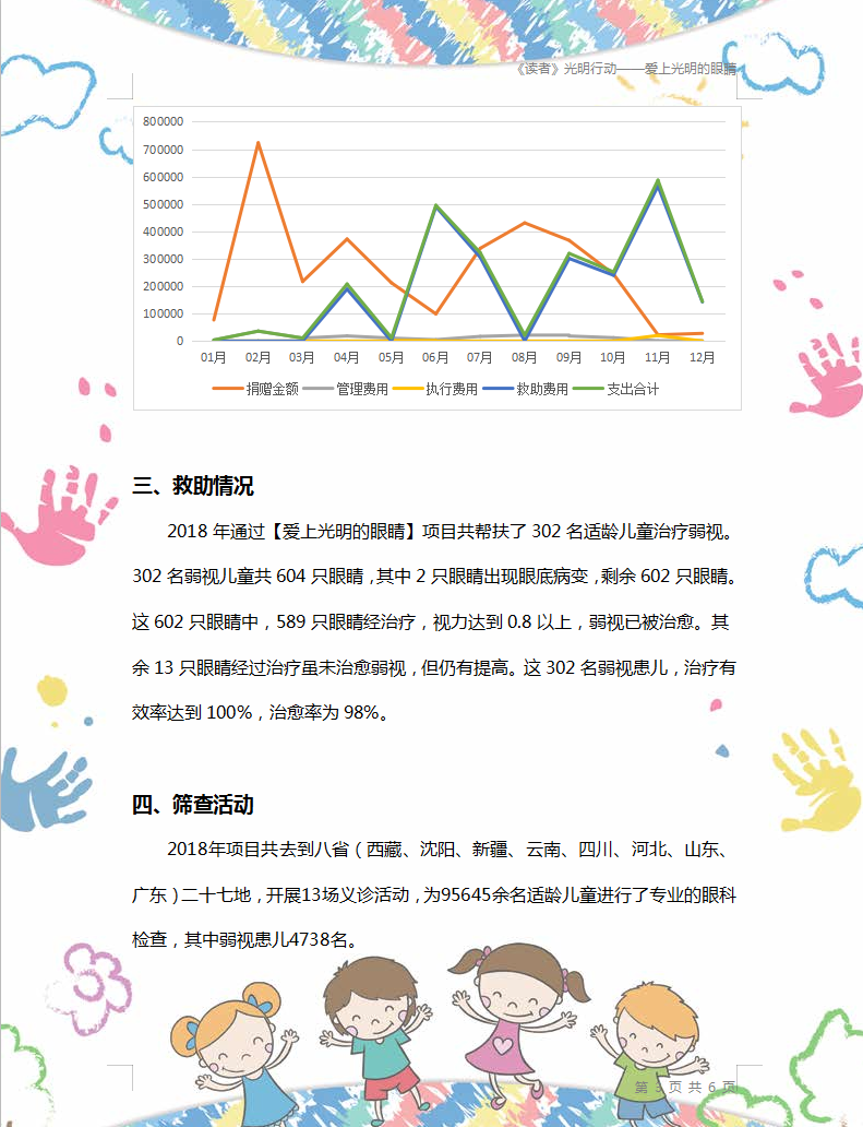 2018年【爱上光明的眼睛】项目共计收到3,131,736.41元善款,支出2,412,436.61元。共去到八?。ㄎ鞑亍⑸蜓?、新疆、云南、四川、河北、山东、广东)二十七地,开展了13场义诊活动,为95645余名适龄儿童进行了专业的眼科检查,帮扶了302名适龄儿童治疗弱视。