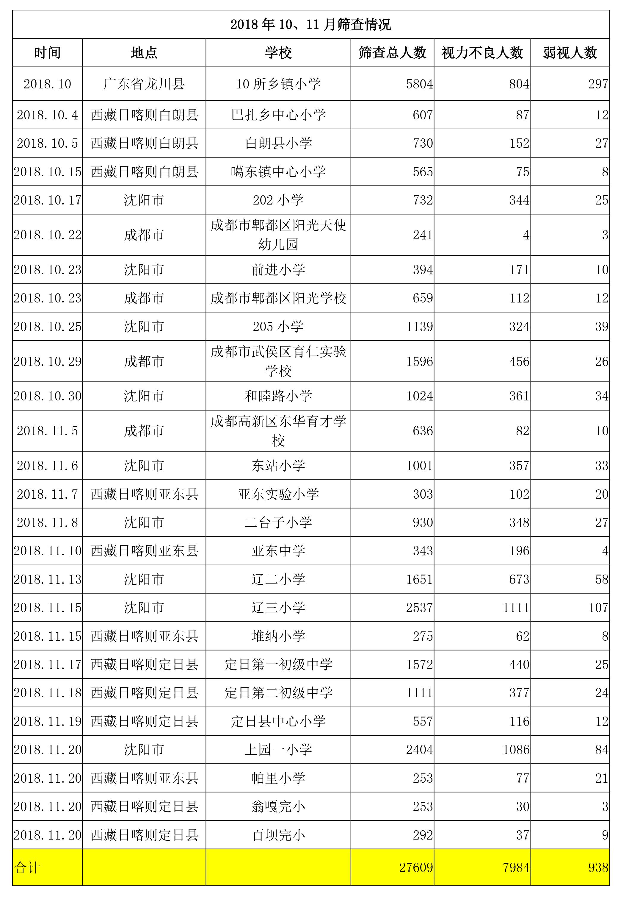 2018年10月、11月,“爱上光明的眼睛”项目共收到善款266,705.24元,共去到四省六地为27609名适龄儿童进行眼部义诊,经检查,7984名儿童存在眼部健康问题,938人被初步确诊为弱视。后续我们将逐步安排符合救助条件的孩子接受免费治疗,让孩子们拥有健康的视力。