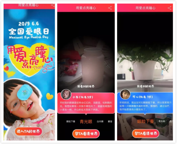 6月6日全国爱眼日,阿里巴巴公益在淘宝发起了“用爱点亮瞳心”公益线上活动,网友打开淘宝即可通过AR功能,从几位分别患有不同程度眼病孩子的独特视角去看这个世界,用真实感受结合孩子们的个案故事唤起网友对儿童青少年眼病的重视?;疃舷弑阋⒓蠊刈?。