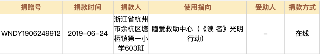 6月24日,我们收到了来自浙江省杭州市余杭区塘栖镇第一小学603班同学们的善款,老师和孩子们积攒起一整年的废纸,卖掉后把钱捐给需要帮助的小朋友。其实这已经不是第一次收到来自各个学校同学们的爱心了,感谢大家在忙碌的学习之余,还关心着贫困地区同学们的眼睛!