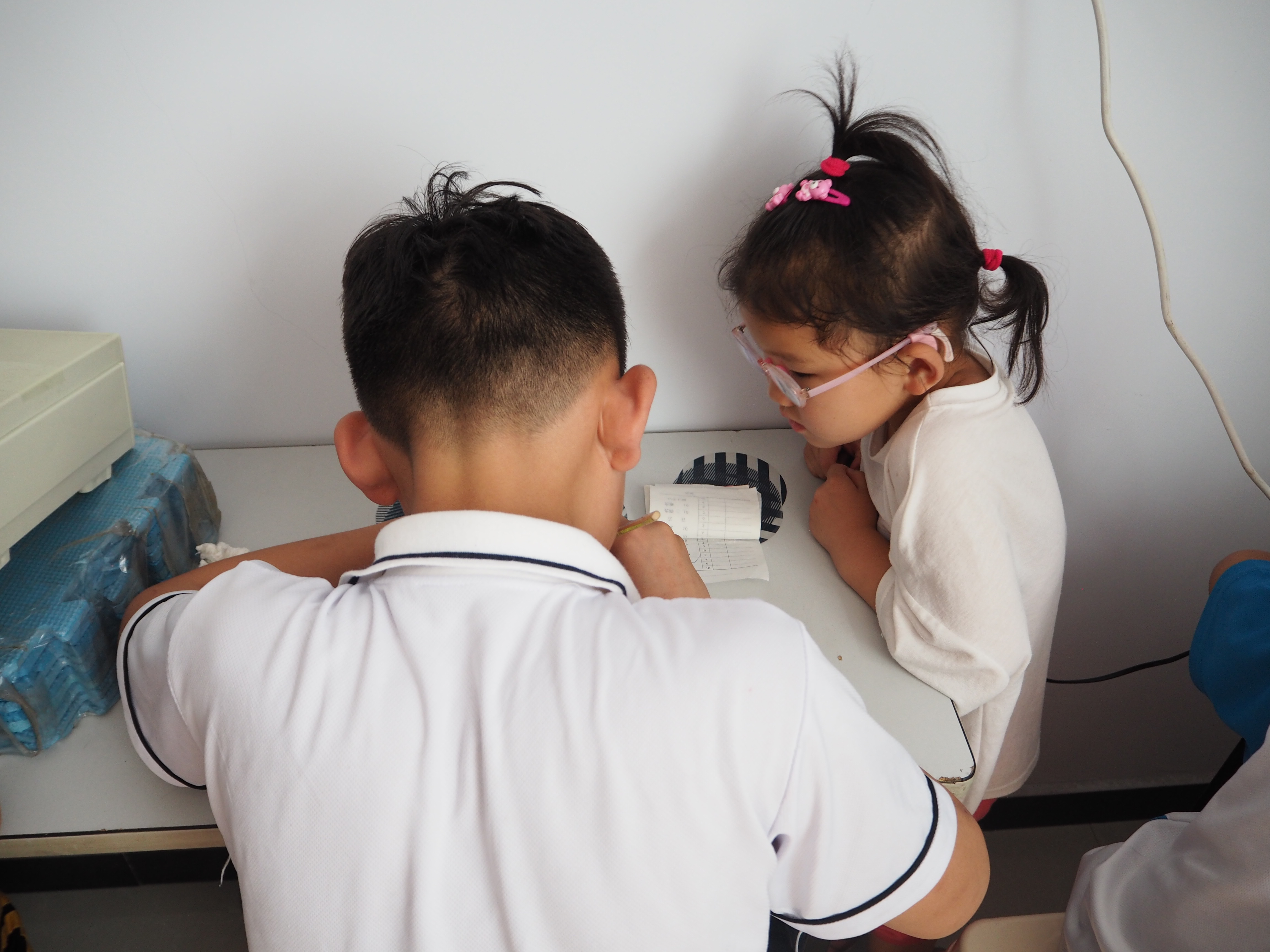 现在小晴晴还在治疗中,已经恢复到了双眼矫正视力0.4,戴着一副厚厚的的眼镜,由于是凸透镜的缘故,她的眼睛被放大了许多,看着萌萌的,很可爱。因为摘下眼镜还是看不清,所以她特别抗拒摘掉眼镜,躲在镜片后,她有着莫大的安全感。在治疗室,小晴晴还不太能坐得住,到处跑来跑去,最喜欢凑在哥哥身旁看着他做治疗。