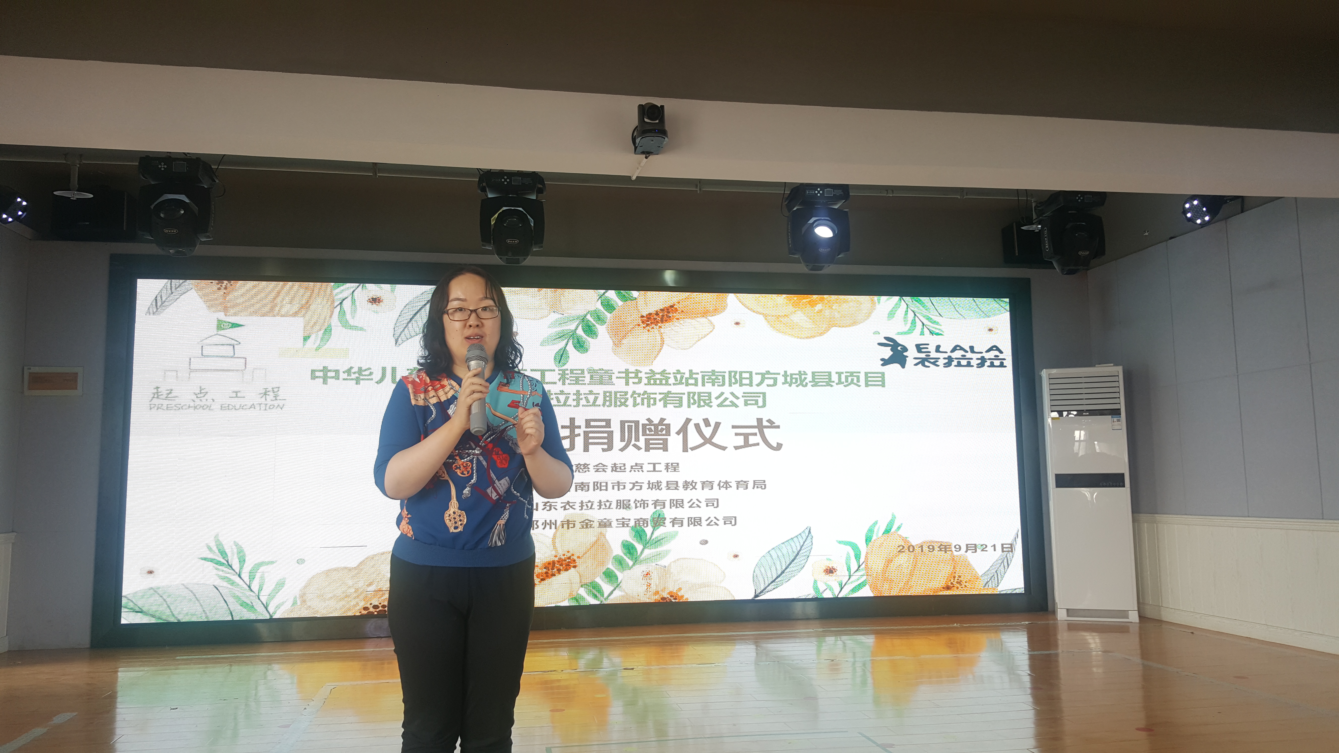 9月21日,河南省南阳市方城县幼师公培培训第二期暨山东衣拉拉服饰有限公司图书捐赠仪式在方城县圆满举行。衣拉拉河南省总代理郑州市金童宝商贸有限公司运营经理栾华丽、中华儿慈会起点工程高级项目官员唐毅楠、方城县教体局基教科王伟、南阳师范学院教育科学院副院长李辉、南阳市第一实验幼儿园园长贺晓红等出席了仪式。