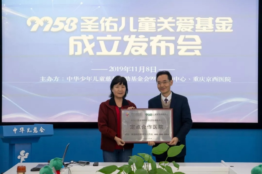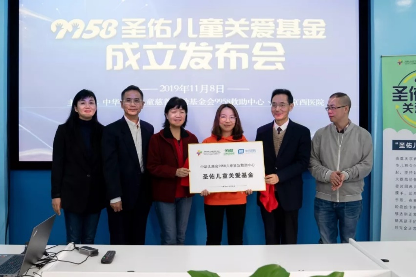 2019年11月8日,中华儿慈会“9958圣佑儿童关爱基金”成立发布会在北京举行。中华儿慈会副秘书长徐惠芳、中华儿慈会理事长助理卫中、重庆京西医院院长王沛忠、重庆京西医院烧伤科主任刘洋、重庆京西医院烧伤科护士长孙丹、中华儿慈会秘书长助理兼9958救助中心总监王昱、中华儿慈会9958医疗社工部主管陈文慧、中华儿慈会9958综合管理部主管韩丹丹等参会。
