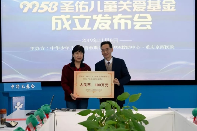 发布会现场,重庆正格企业管理咨询有限公司委托重庆京西医院院长王沛忠代表爱心企业,向中华儿慈会捐赠100万元启动金,宣布“9958圣佑儿童关爱基金”正式成立。