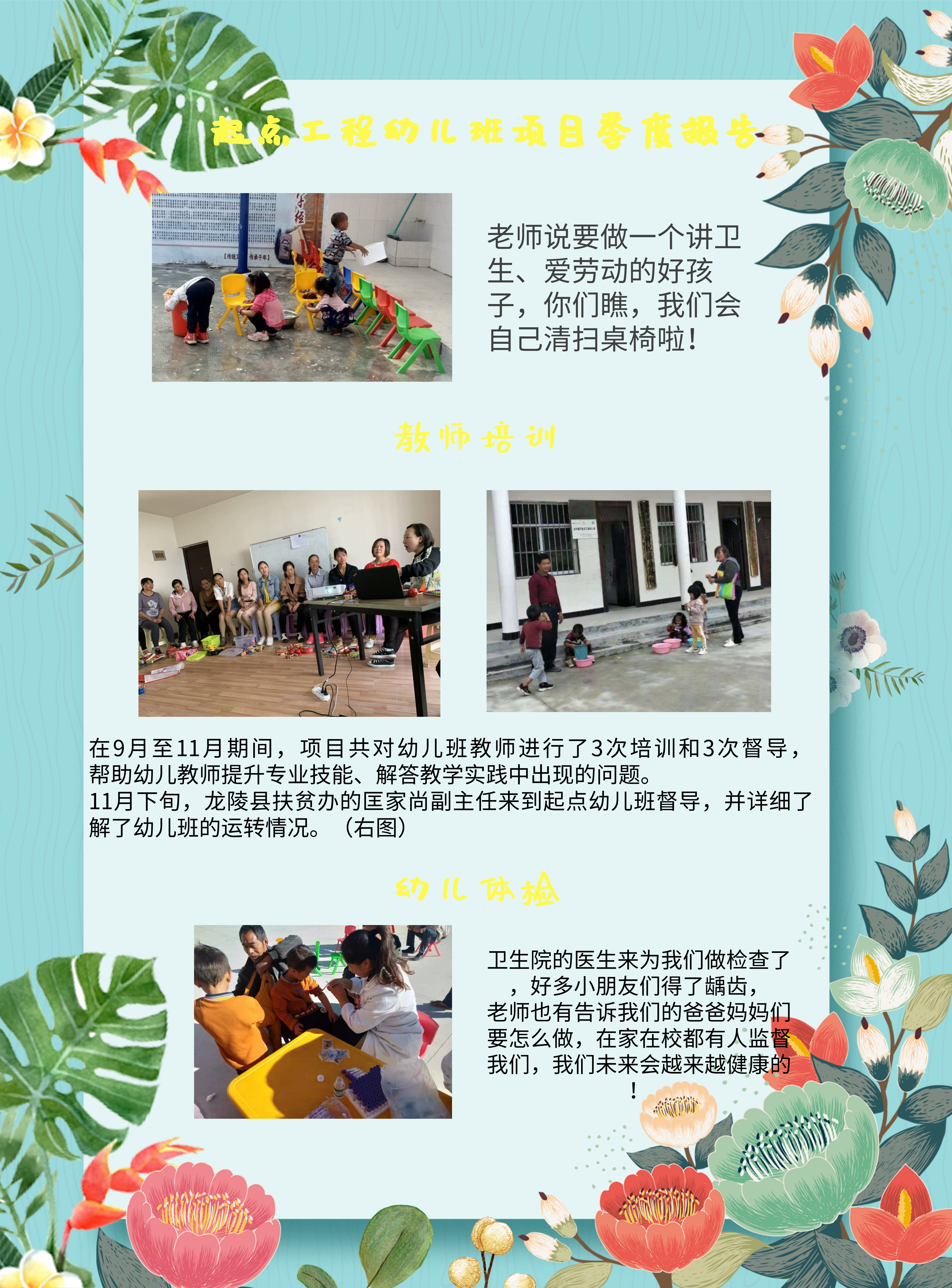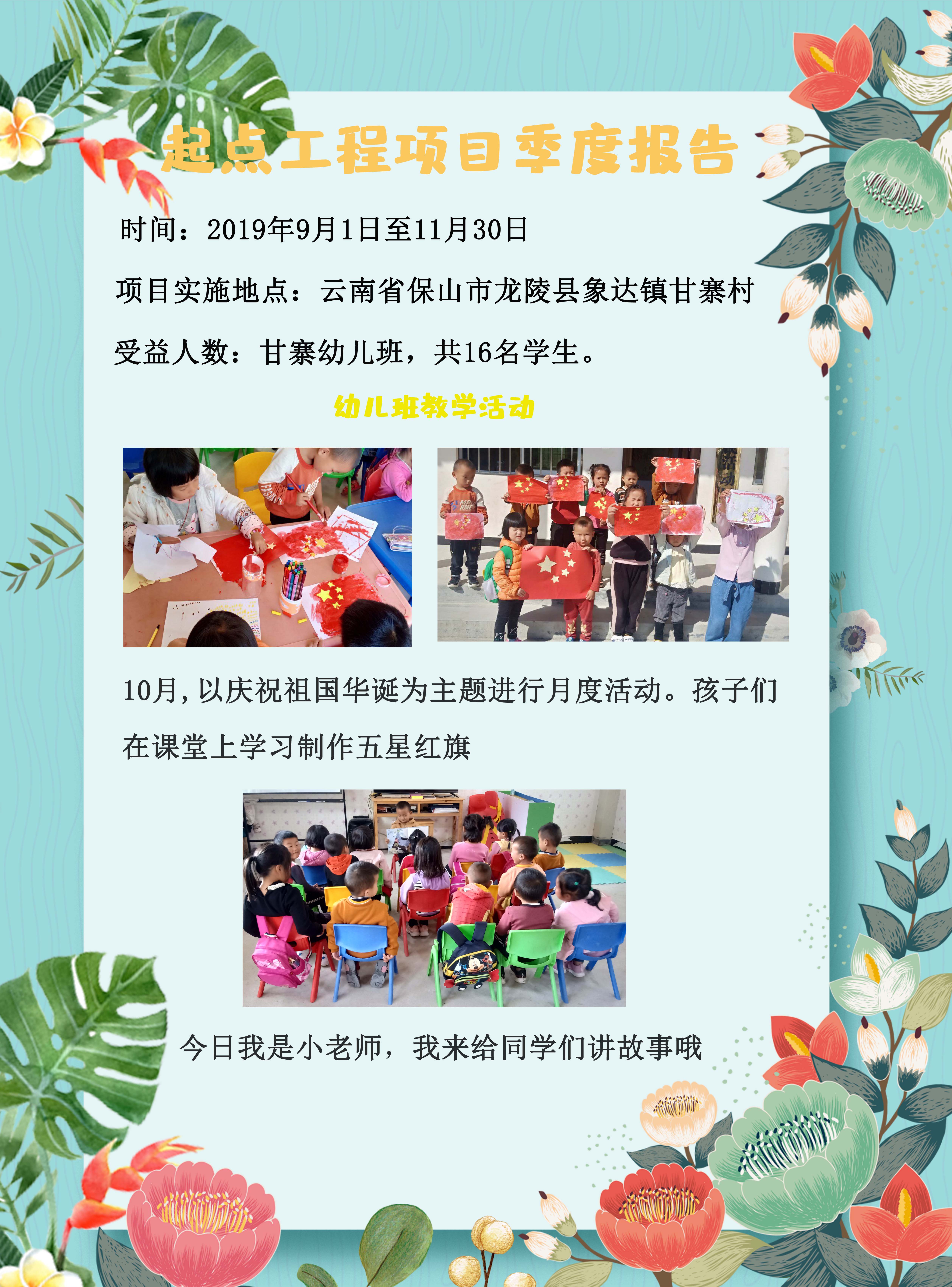 云南省保山市龙陵县象达镇甘寨村起点未来希望幼儿班里的16名小朋友在2019年9月至11月之间度过了快乐的学习时光。通过项目执行人员的反馈,我们了解到小朋友们进行了“我们的幼儿班”、“我们的国家”等主题的活动课,在课堂中,小朋友们熟悉了学校的环境、养成了良好的卫生习惯,还对我们伟大的祖国有了更深刻的了解。感谢法国兴业银行对学前教育事业的支持,让我们一起努力,让每一个小朋友成长为祖国的明日栋梁!