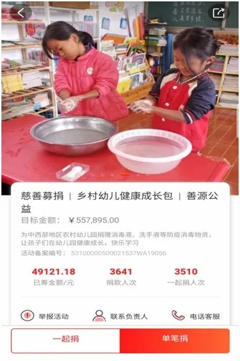 2020年3月,在疫情还在肆虐的时候,为了守护我国中西部贫困地区农村幼儿园小朋友的健康,中华儿慈会起点工程项目通过善源公益平台,发起“乡村幼儿健康成长包”公益项目。在广大爱心网友、爱心企业的支持下,截止到2020年4月9日,该项目累计有3600多人次参与捐赠,发起一起捐160个,累计筹款49000多元。