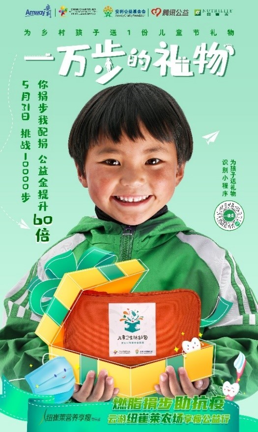 5月31日,六一国际儿童节到来之际,安利公益基金会联合中华少年儿童慈善救助基金会、通过腾讯公益平台,发起“一万步的礼物”公益捐步活动,将从4月11日开始的1万步常规配捐1元的公益金,仅在5.31当日膨胀60倍,“你走1万步,我捐60元”,为乡村儿童采购一份“卫生防护包”。公众可通过微信“一块走”小程序即时参与,健康自己帮助他人,为乡村孩子送去一份儿童节礼物。