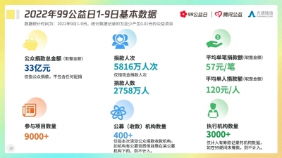 近日,腾讯公益与方德瑞信联合发布了《2022年99公益日筹款数据盘点(整合版)》(以下简称报告)。2022年是腾讯99公益日的第八年,今年除了9月7日至9日的主会场外,腾讯公益还于9月4日至6日同时举办了三场针对河南、江苏和活水计划的“乡村振兴”专场。