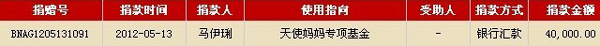 5月17日,天使妈妈团队长沙成员“淘妈”通过确认,天使基金小飞专用账户已收到来自马伊琍和白百何的捐款。其中,马伊琍捐款四万元、白百何捐款十万元。
