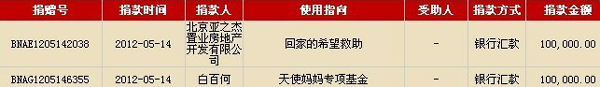 事实上,这两笔捐助已分别于本月13日和14日到账,之所以今日才确认,是由于近段时间中华儿慈会在线捐赠后台在进行调整,延误所致。