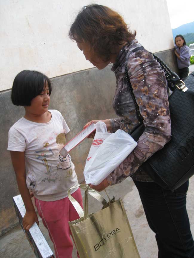 也有的孩子希望去县城看一场电影,有的孩子希望去一次公园;有的孩子希望有一辆自行车可以骑着去山下的学校上学,义工就把孩子喜欢的自行车颜色记录下来;有的孩子希望有一双鞋子,志愿者就把鞋码统计上来;有的孩子希望获得一件裙子,志愿者就把孩子的身高体重登记下来,更多的孩子是希望有学习用品、书包、图书、文具等。
