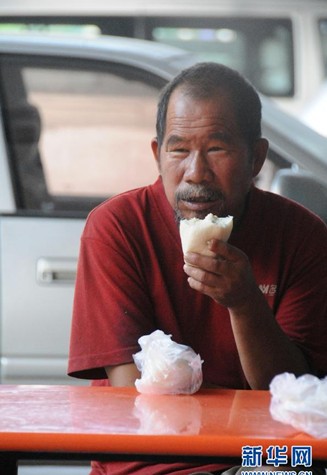 一名家境贫寒的人在馒头店里吃着馒头,馒头店规定,在店里可以随便吃,而每次仅仅允许带走两个。目前,有近200人长期在这家店领取馒头(8月22日摄)。 新华社记者郭圻摄