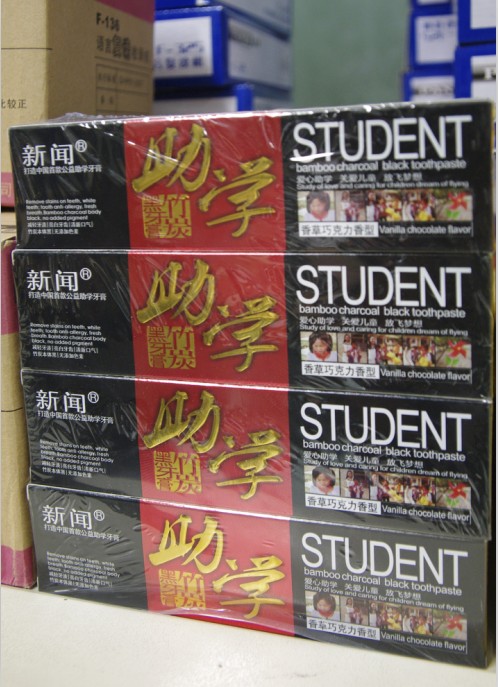 新闻助学牙膏是中国首款公益助学牙膏,由深圳市新闻日化用品有限公司打造。根据助学的内涵和公司的企业文化,新闻助学牙膏包装设计风格经典,红色彰显热情、温暖、喜庆、大方,与传统章印元素融合,既体现中国传统文化以爱经营爱的内涵,又示意新闻公司是友爱大家庭。这款新闻助学竹炭牙膏所得收益将全部用于资助贫困地区孩子就学、捐建梦想图书馆及相关公益助学计划。