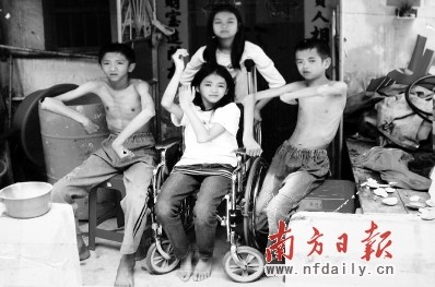 惠州黄家四兄弟姐妹都是“瓷娃娃”,在这张两年前的旧照片中,坐轮椅者为老三黄冬娇,她骨折次数最多,但仍坚持上学。受访者供图