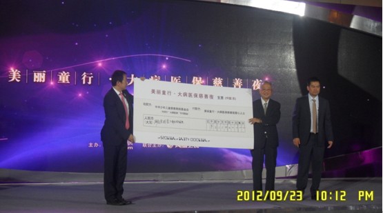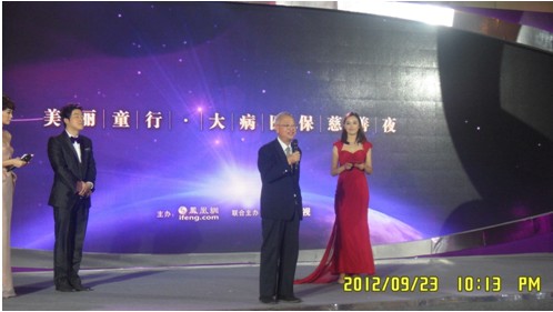 2012年9月23日中华儿慈会中国乡村儿童大病医保公益基金在北京JW万豪酒店举行“2012美丽童行•大病医保慈善夜”,中华少年儿童慈善救助基金会理事长、中宣部、卫生部等有关领导、商界、演艺界及海外驻华使馆有关人员共享盛宴,支持中国慈善公益事业的发展。