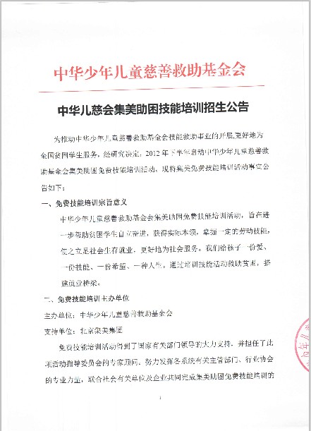 为推动中华少年儿童慈善救助基金会技能救助事业的开展,更好地为全国贫困学生服务,经研究决定,2012年下半年启动中华少年儿童慈善救助基金会集美助困免费技能培训活动。现将集美免费技能培训活动事宜公告如下: