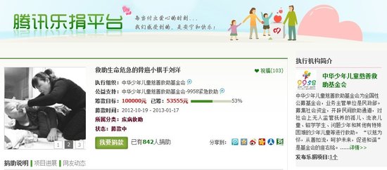 腾讯一直关注着小刘洋的病情,当得知这个不幸的家庭急需医疗费用的时候,腾讯公益马上联络儿慈会9958儿童紧急救助中心,并发起了为小刘洋的捐助筹款活动。通过此次活动,腾讯公益和儿慈会9958儿童紧急救助中心希望募得10万元人民币的医疗费用,以帮助小刘洋与病魔作斗争。迄今为止,“腾讯乐捐平台”已经为刘洋募集了53555元善款,已达预期募集金额10万元的50%。