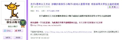 “书香中国”抄了“快乐小陶子”?2012年9月12日,中华儿慈会天下溪基金快乐小陶子教育公益工作室(以下简称“小陶子”)创始人安庆华在其新浪微博上质疑大学生公益项目“书香中国流动图书馆”(以下简称“书香中国”)抄袭其工作室项目“快乐小陶子流动图书馆”,参加“黑苹果青年社会创新营&青年公益创业扶持计划”(以下简称“大学生黑苹果”)大赛。在微博上,安庆华将矛头指向河南省青联委员、濮阳恩来爱心联盟秘书长方红,并向对方发问:两者有何不同?拿着这样的项目设计书参加比赛,不觉得难受么?