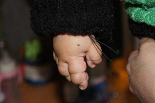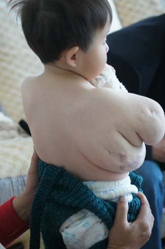 随着小心蕾一天天成长,她胸口的肿块也越来越大。今年2月份,王伟夫妇带着出生仅5个月的小心蕾赶到北京,经北京儿童医院和中国人民解放军陆军总院儿童医院检查,再次被诊断为血管瘤。由于小心蕾只有5个月大,医院没有采取手术治疗。