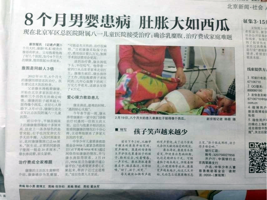 父亲康永涛抱着康康,开始在北京多家医院求医,辗转三个月仍无法确定病情??悼档亩亲釉嚼丛酱?,鼓得像个西瓜。在好心人帮助下,2月17日,康康住进北京军区总医院附属八一儿童医院。