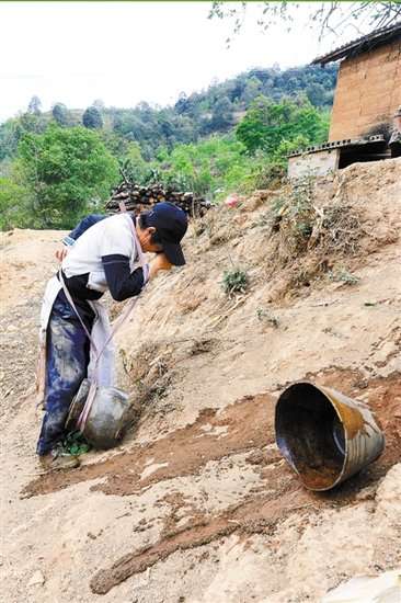 4月3日,苗村箐门50岁的韩文祥好不容易背了一罐水,在家门口的土坎子上坡时摔倒了,罐子破了,水洒了,他当场放声大哭。