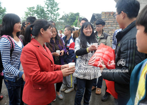 本报记者(右)在雅安灾区发放善款,村民忙感谢好心人