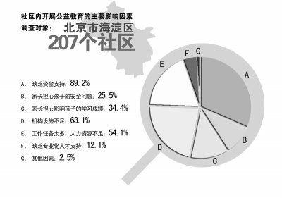 缺乏资金支持、社区机构设施不足和人力资源短缺是影响当前社区开展公益教育活动最为主要因素,安全问题与学习成绩次之。