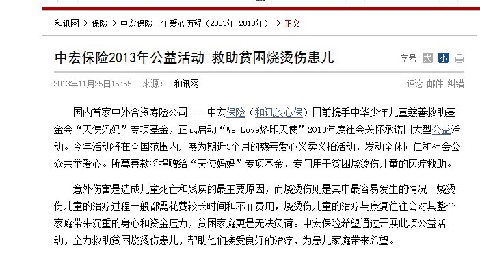 国内首家中外合资寿险公司——中宏保险(和讯放心保)日前携手中华少年儿童慈善救助基金会“天使妈妈”专项基金,正式启动“We Love烙印天使”2013年度社会关怀承诺日大型公益活动。今年活动将在全国范围内开展为期近3个月的慈善爱心义卖义拍活动,发动全体同仁和社会公众共举爱心。所募善款将捐赠给“天使妈妈”专项基金,专门用于贫困烧烫伤儿童的医疗救助。