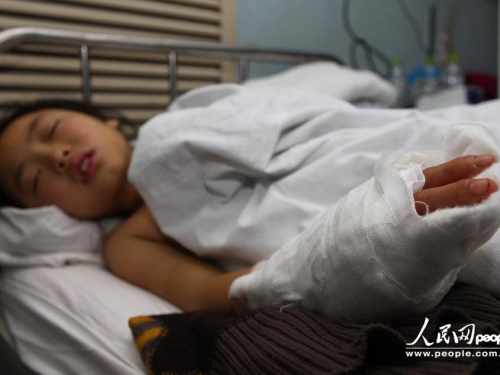 2012年12月17日,北京市积水潭医院,8岁女孩小李,前晚和父母一起回家,路上遇人打群架。其父劝说不要打。却惹恼对方。对方一拥而上,殴打父亲。对方甚至用刀砍断了小李的左手。图为莫名其妙被砍,老李很难过。