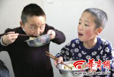孩子喜欢吃面条,10岁的褚飞鹏(右)都是端着盆子吃饭
