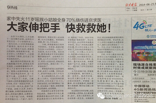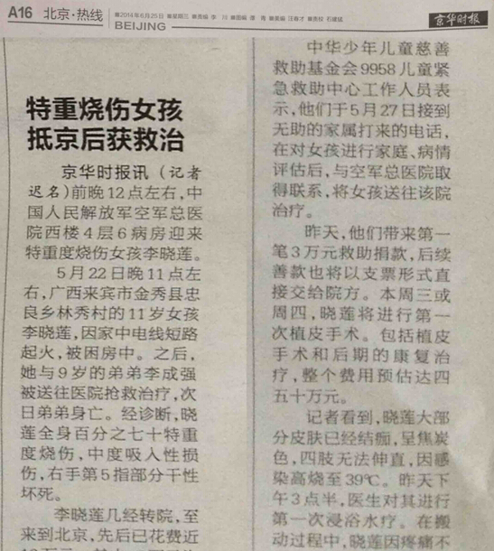 《北京晨报》、《京华时报》和《北京晚报》等媒体热切关注晓莲的救助情况,纷纷进行报道,为她募集后续的治疗费。希望在大家共同的努力下,晓莲可以尽快好起来!