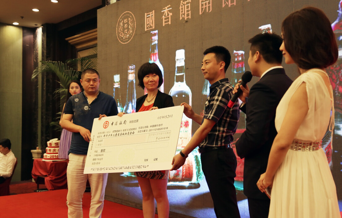 2014年6月 18日,中国老名酒精品收藏展暨国香馆开馆两周年庆在北京船舶重工酒店举办。庆典邀请业内人士共同见证国香馆的发展历程,并邀请中华少年儿童慈善救助基金会9958救助中心共同发起公益慈善拍卖活动,为9958救助的一名4岁贫困烧伤男孩募集医疗善款。让爱在浓浓酒香中升华。