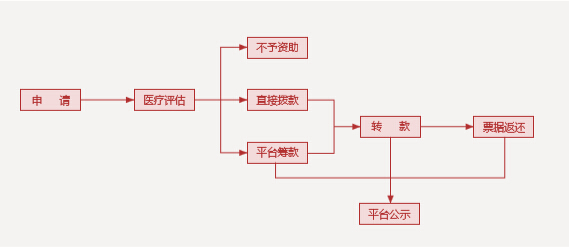 紧急救助的全部流程分为:第1步患儿家属申请 救助,第2步医疗专业评估团评估救助条件,第3步 对符合救助条件的患儿进行直接拨款、开通平台进 行筹款,第4步向患儿转款以及第5步相应财务票据 返还,全过程最快在两小时内完成,并做到财务公 开透明。