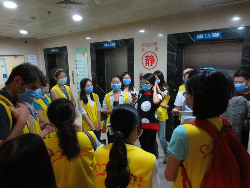 活动开始前,消毒完毕,志愿者们认真倾听着陪护的注意事项。