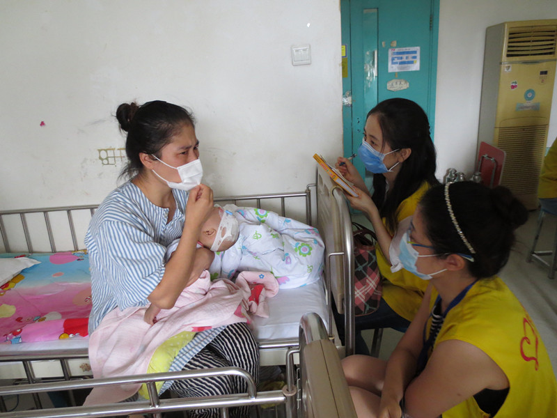 这两位志愿者在听孩子妈妈讲述孩子发病及治疗过程,记录十分认真。采访之余,她们还为孩子妈妈加油鼓劲,帮她想办法获得生活来源。