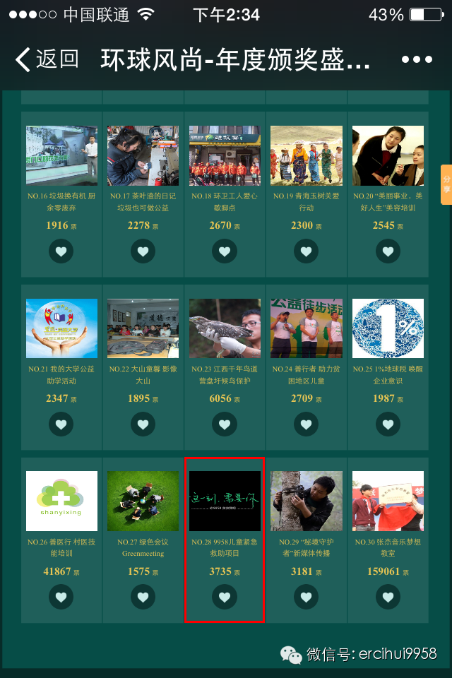 亲们,大家好! 中华儿慈会9958儿童紧急救助项目走过三年春夏秋冬,岁末迎新之际、9958入围2014年环球风尚公益盛典!全民投票所选、公益榜样由你定!期待您给NO.28号9958项目投入宝贵的一票!期待您对9958的持续支持、谢谢!链接:http://fashion.huanqiu.com/special/annualawards2014/index.html?from=groupmessage&isappinstalled=0#rd
